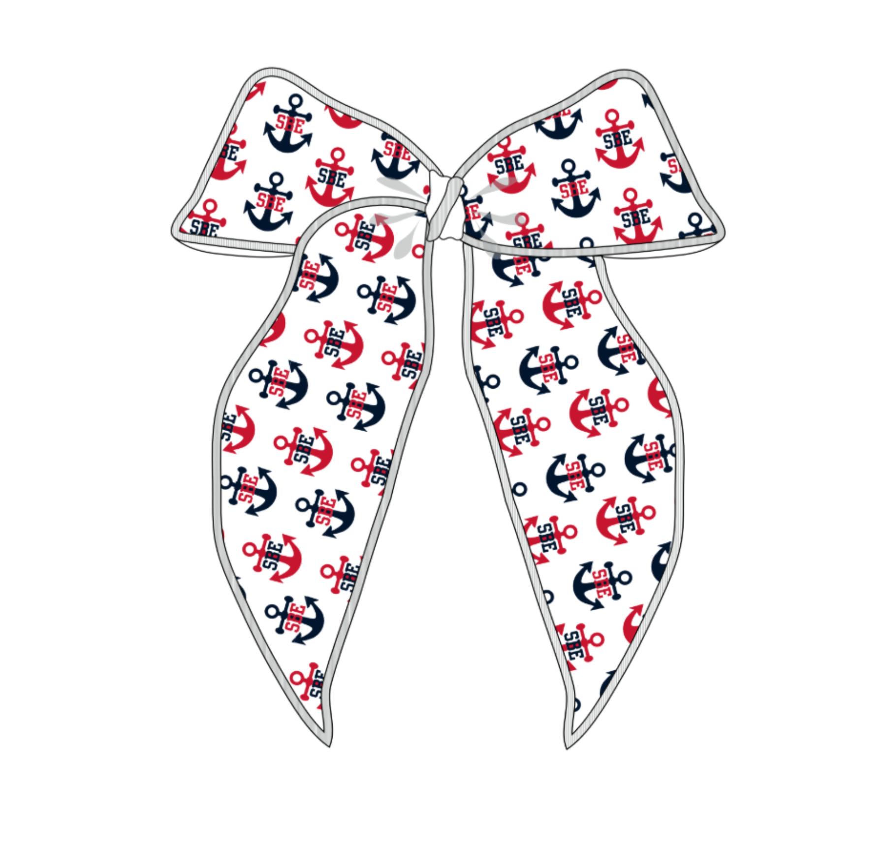 Add a playful pop of school spirit with the SBE Whimsy Tail Medium Bow. Featuring an allover print of the signature SBE anchor logo in bold navy and red, this bow brings a fun, spirited touch to any outfit. Perfect for school days, events, or showing off your SBE pride wherever you go.